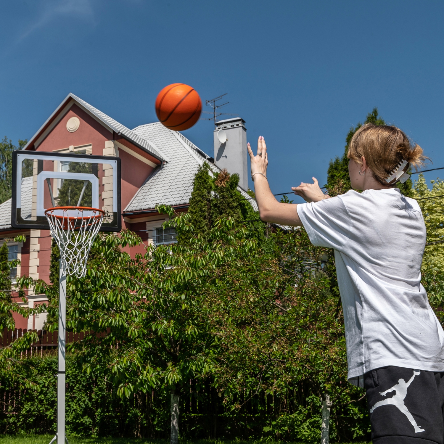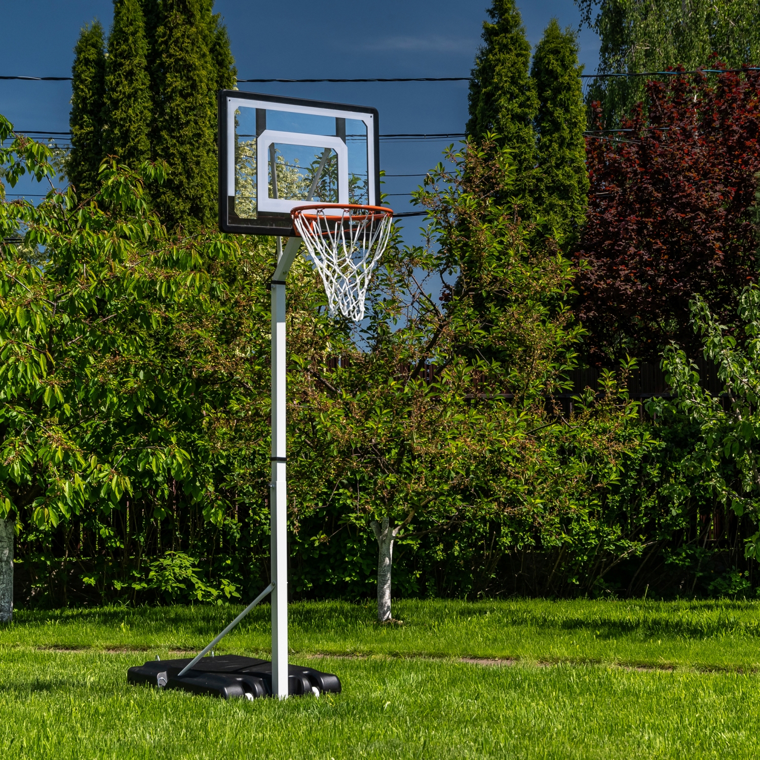 Кольцо диаметром 38 см с сеткой в комплекте. Основание стойки на колёсах, его размер 90 х 60 х 15 см.