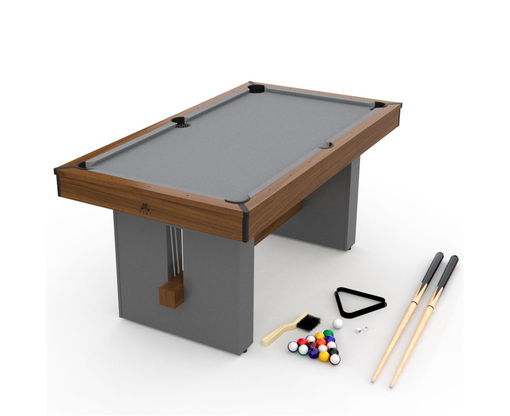 Покрытие игрового поля оттеняет цвет корпуса: серая ткань из шерсти и нейлона. Ценители игры по достоинству оценят качество модели и комфорт от игрового процесса. Ширина луз - 7,5 см. Размеры игрового поля: 146,4 x 71,3 см, а борты толщиной 9,5 см и высотой 2 см.