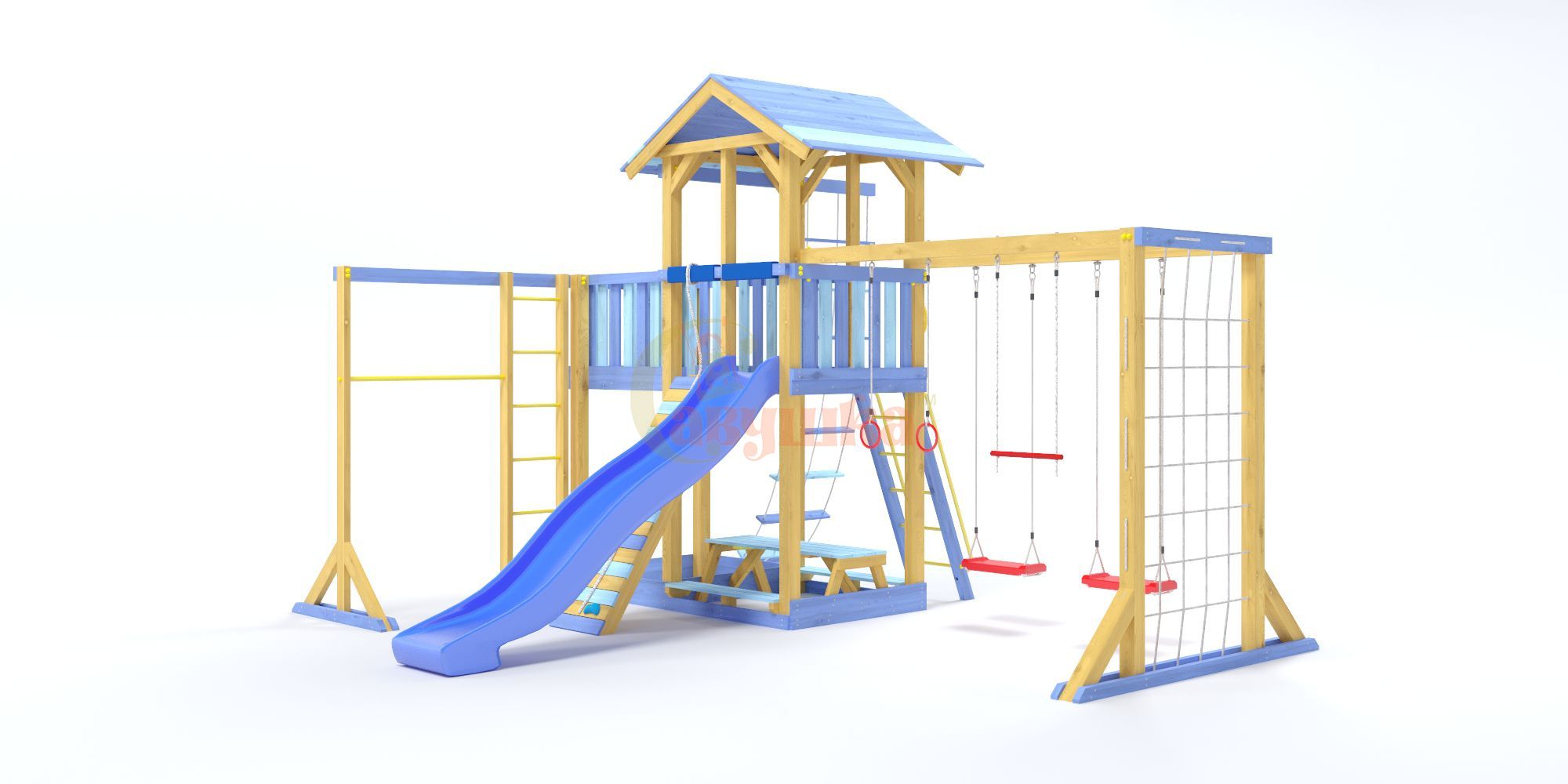 Каркас комплекса выполнен из сосны и окрашен в яркие цвета – сиреневый и голубой в сочетании с натуральным цветом конструктива. Горка выполнена в синем цвете, что придает комплексу стильный и современный вид. В стандартной комплектации предусмотрена дизайнерская деревянная крыша из трех гармоничных цветов.