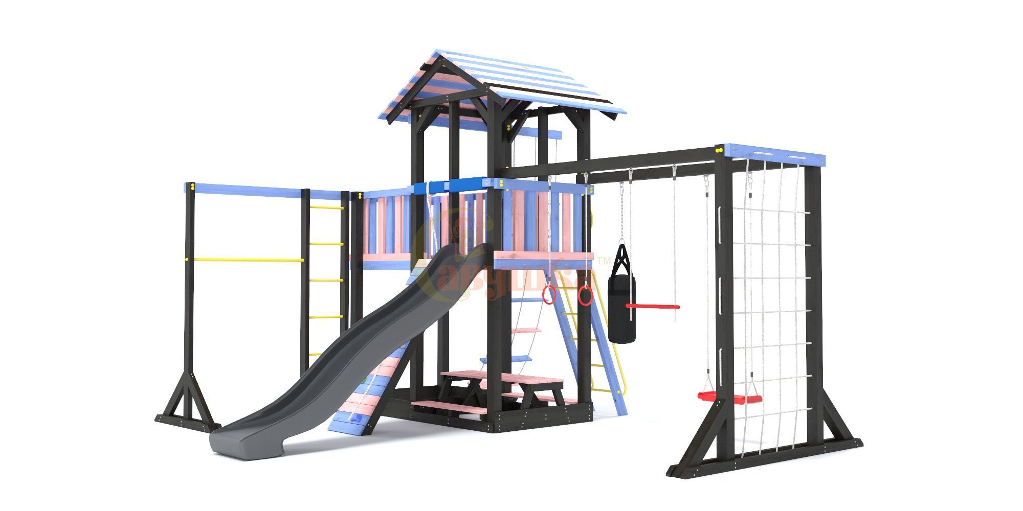 В комплекте игровой площадки имеется все необходимое оборудование – горка, качели, трапеция, кольца гимнастические и боксерская груша, которые подходят как для малышей, так и для более активных детей. Кроме того, на площадке имеется столик с лавочками для рисования или игры в куклы.