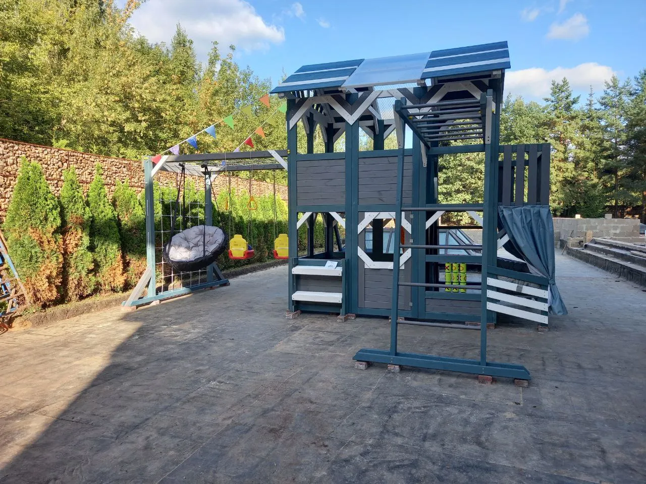 Множество лазательных и спортивных элементов, широкие возможности для тематических игр.