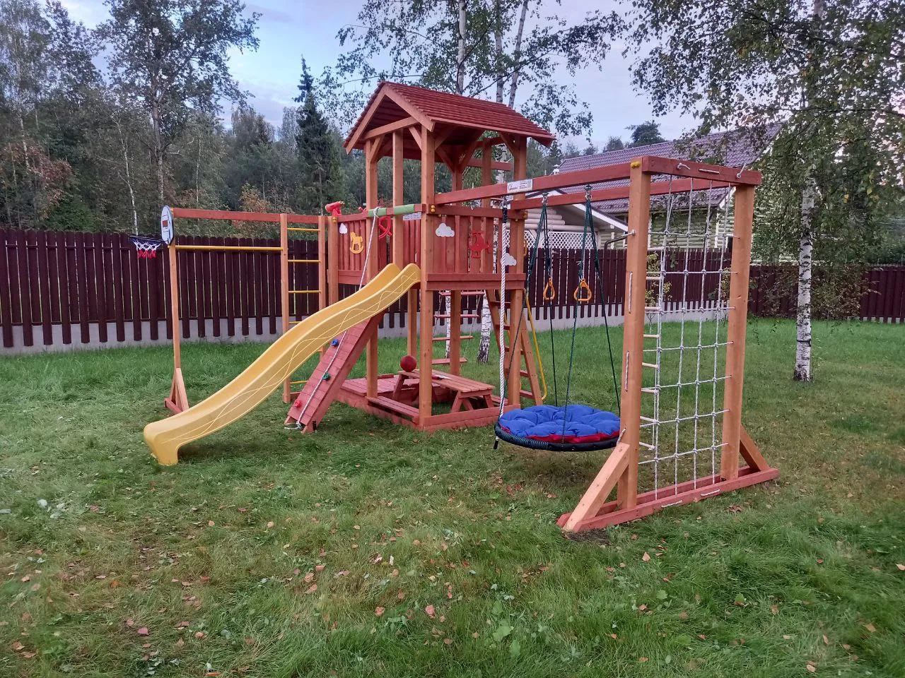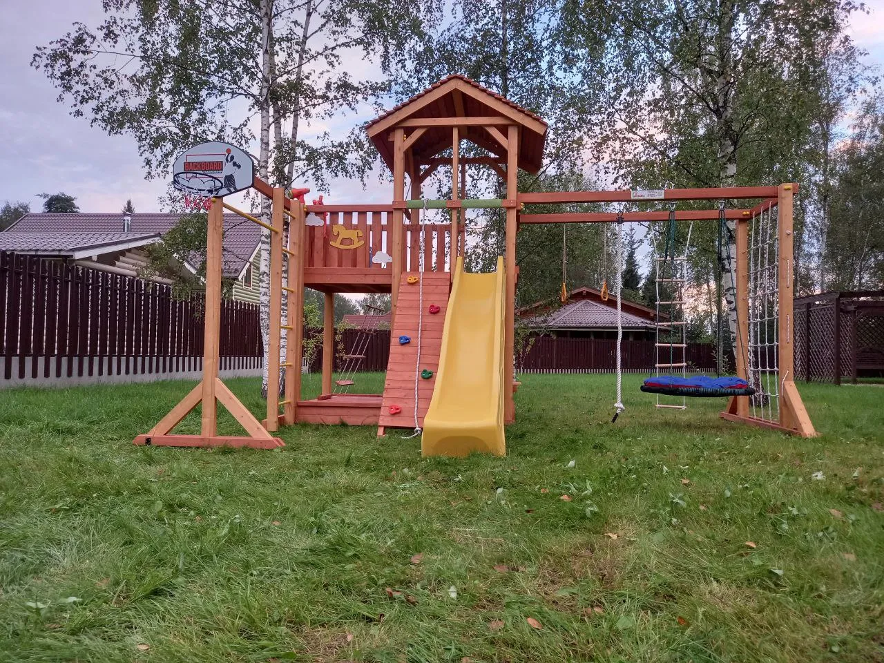 Основным материалом выступает клееный брус. Именно из него сделан каркас игровой башни, качельная рама, а также остальные воспринимающие нагрузку части комплекса - рама с сеткой для лазанья, шведская стенка и т.д. Для защиты дерева от атмосферного воздействия мы используем экологичную краску.