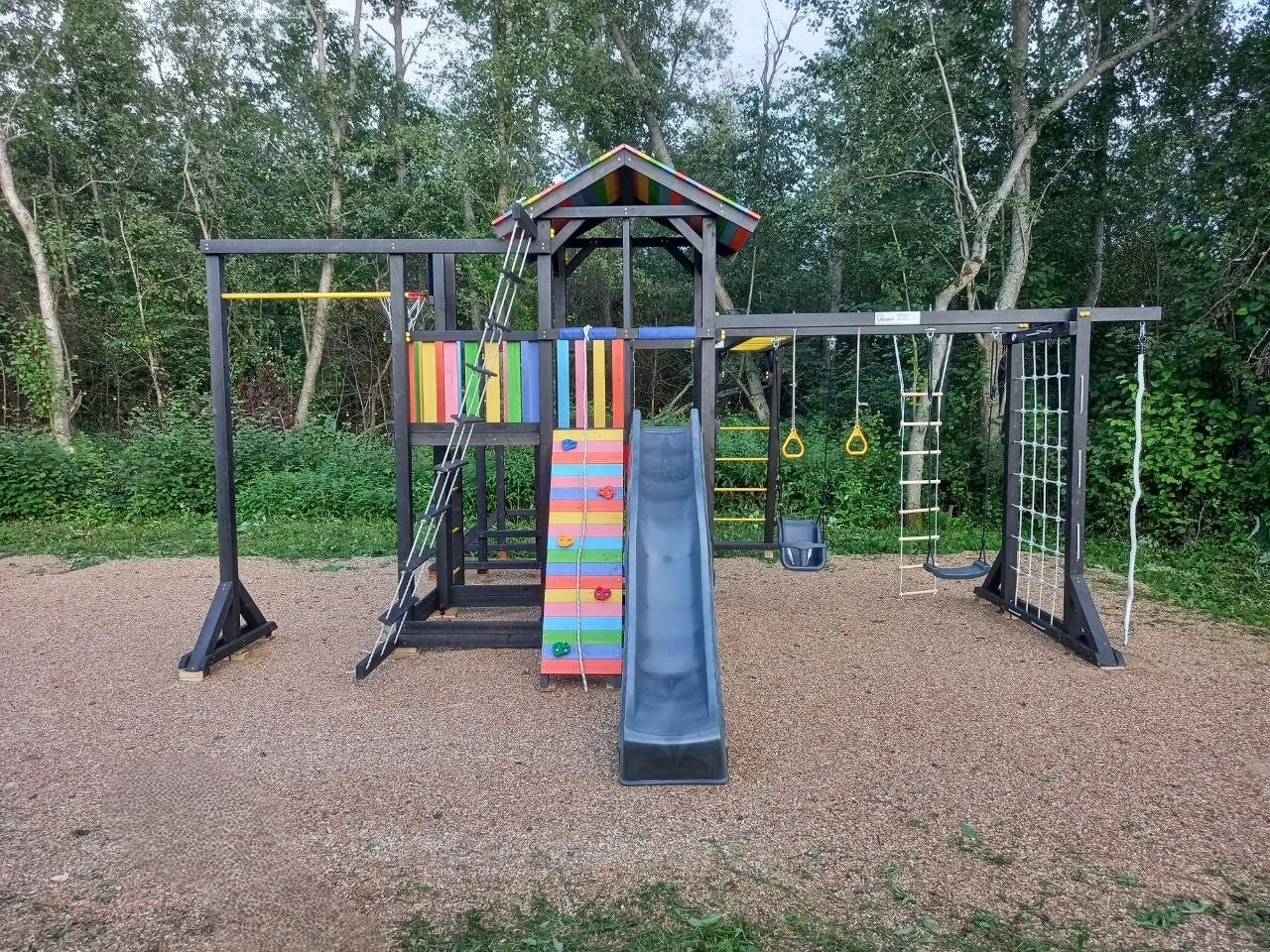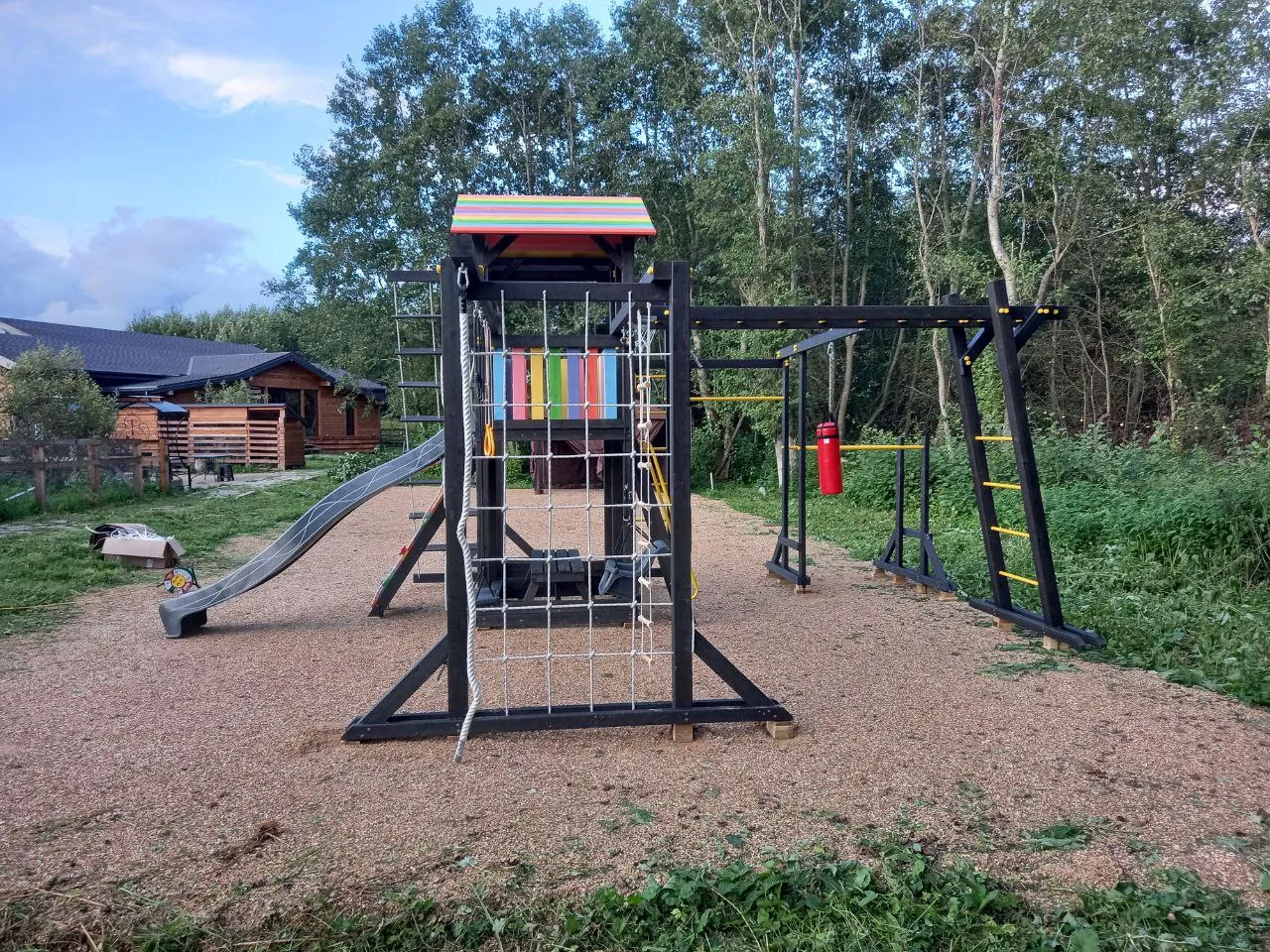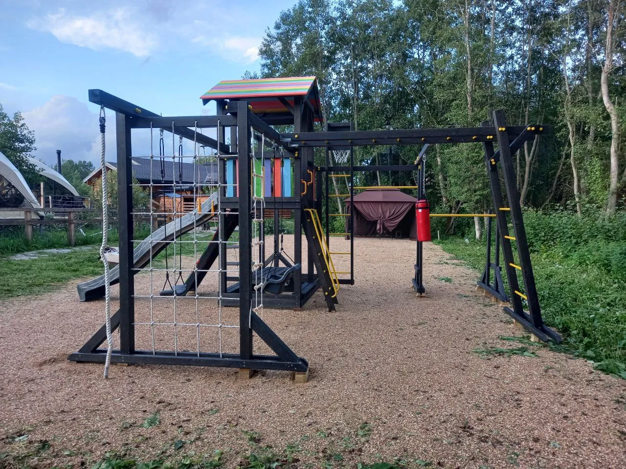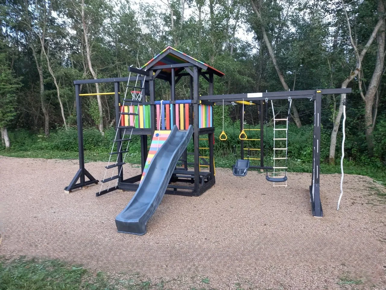 С Савушка 2 (BLACK EDITION) дети смогут улучшить свою физическую форму благодаря турникам, гимнастическим кольцам, параллельным брусьям и баскетбольному кольцу, что поможет развить мышцы, координацию и уверенность в себе. А для маленьких мечтателей — песочница, столик с лавочками и сетка-лазалка для активных игр с друзьями.