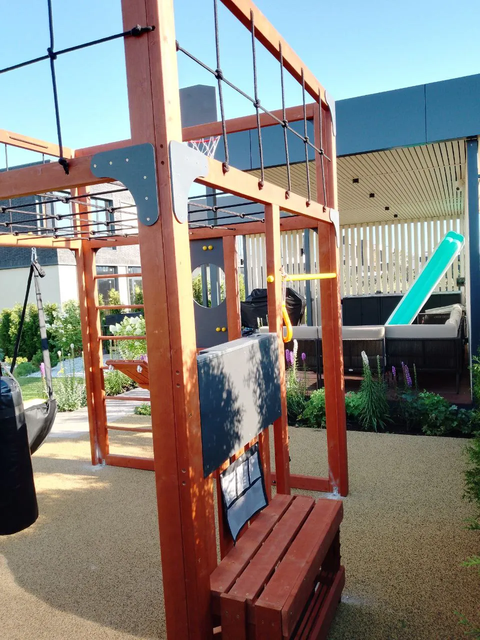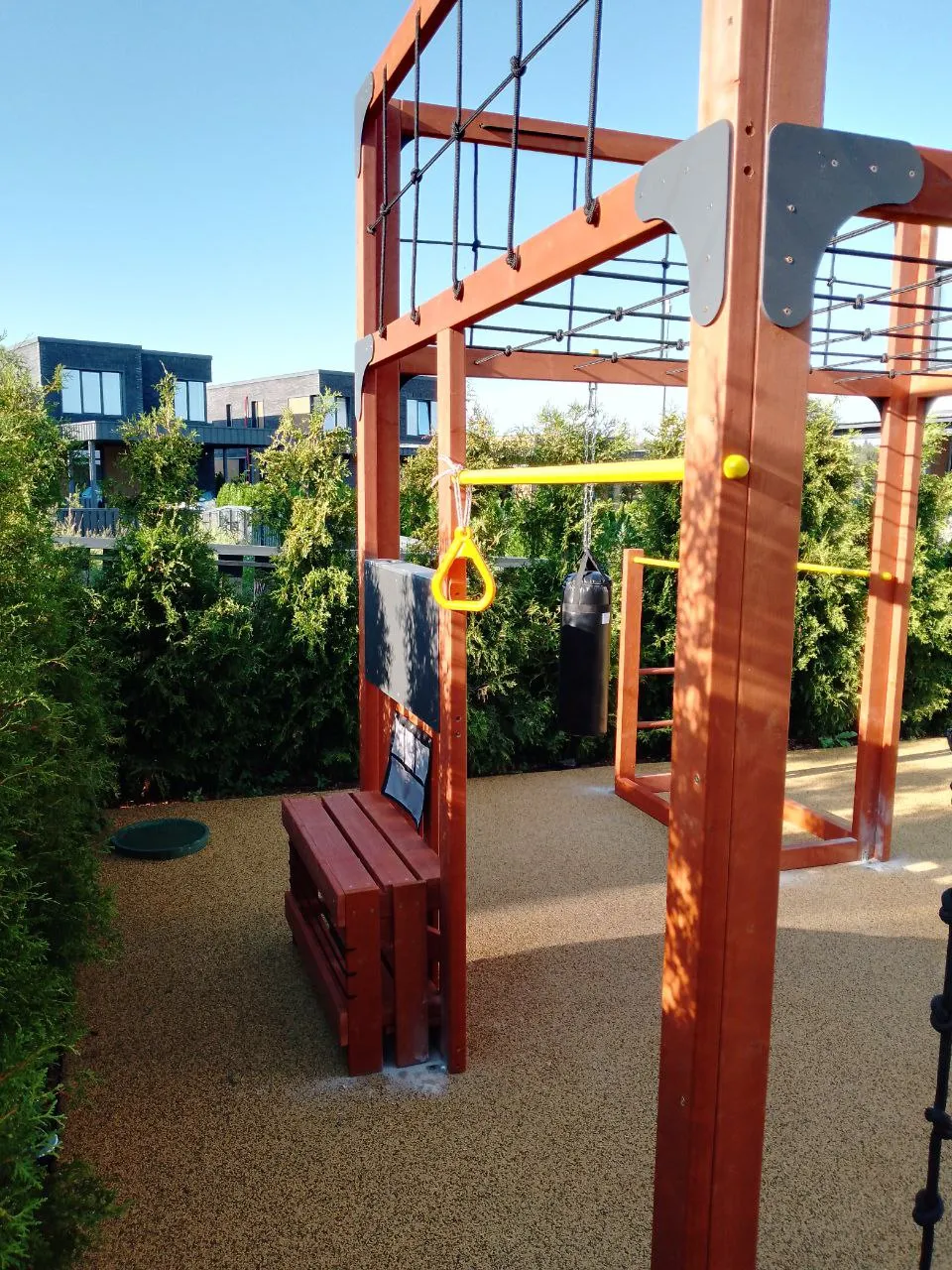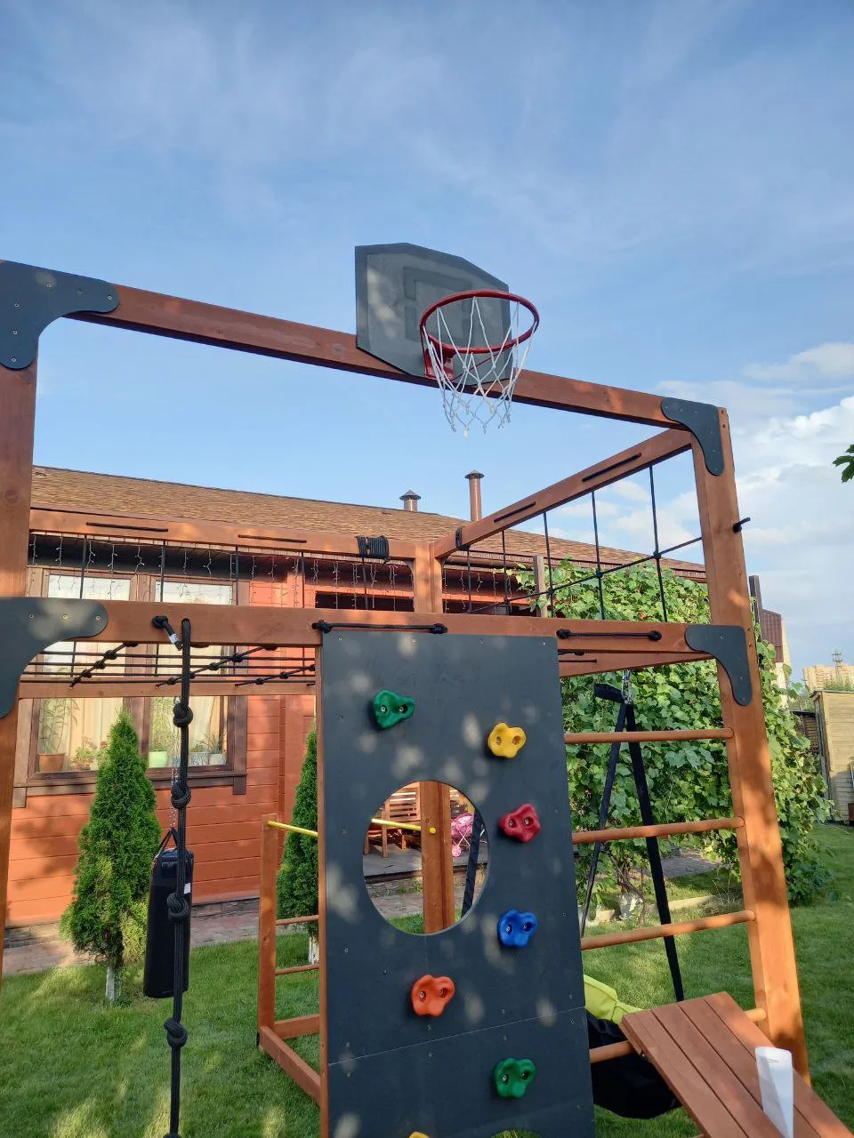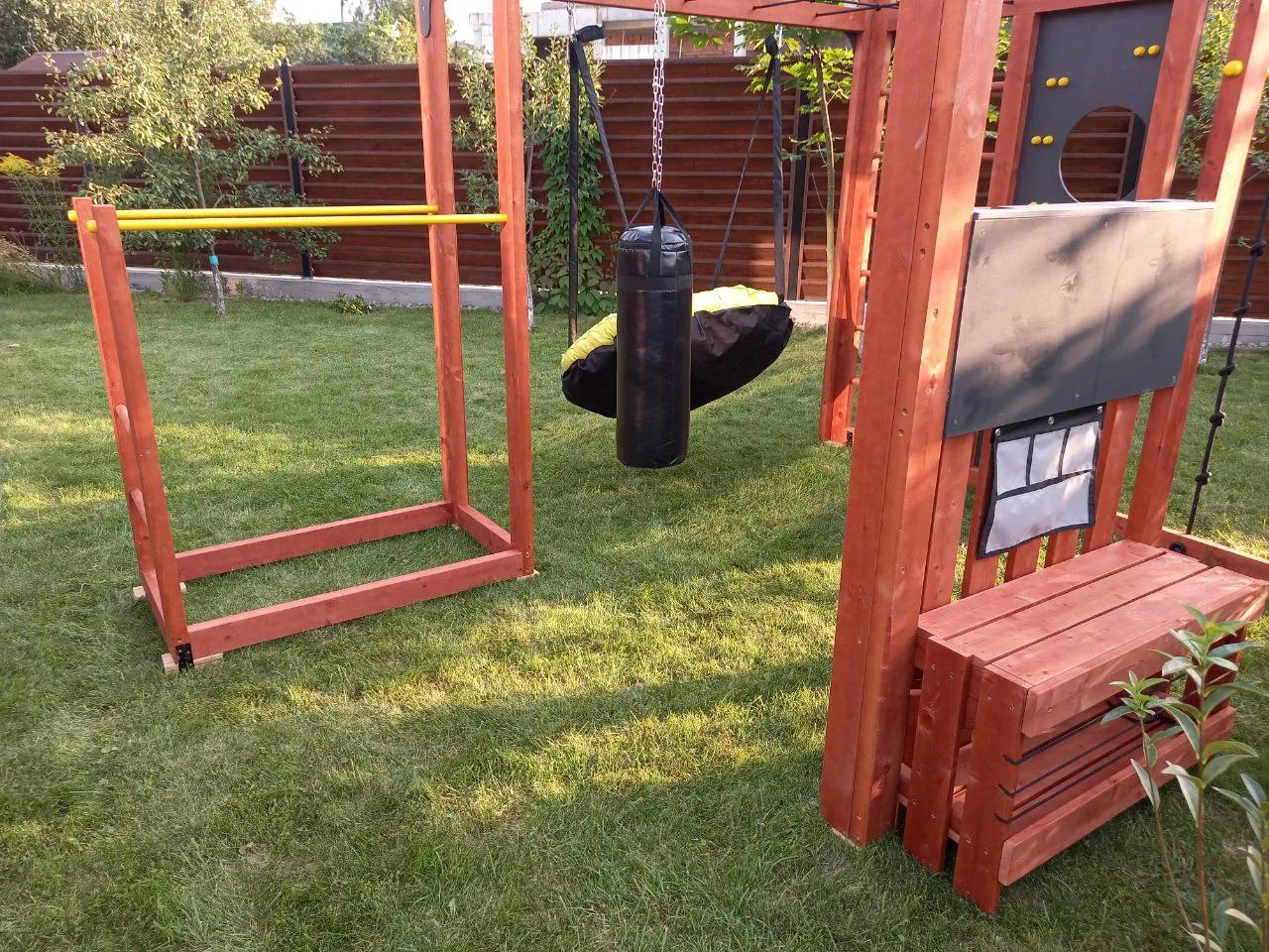 - Нижний спортивно-игровой уровень: включает боксерскую грушу, гимнастические кольца и параллельные брусья для разнообразных физических упражнений.