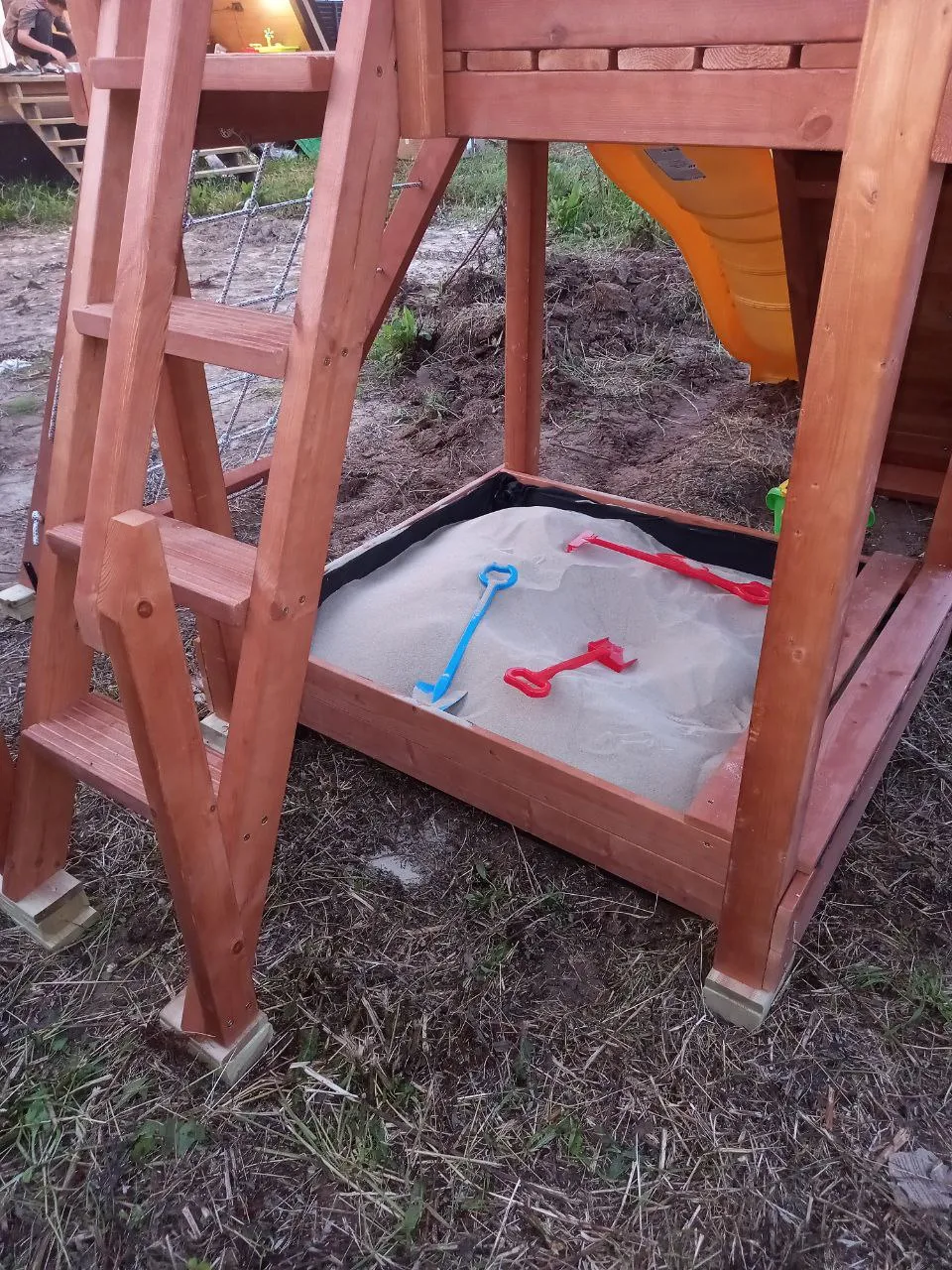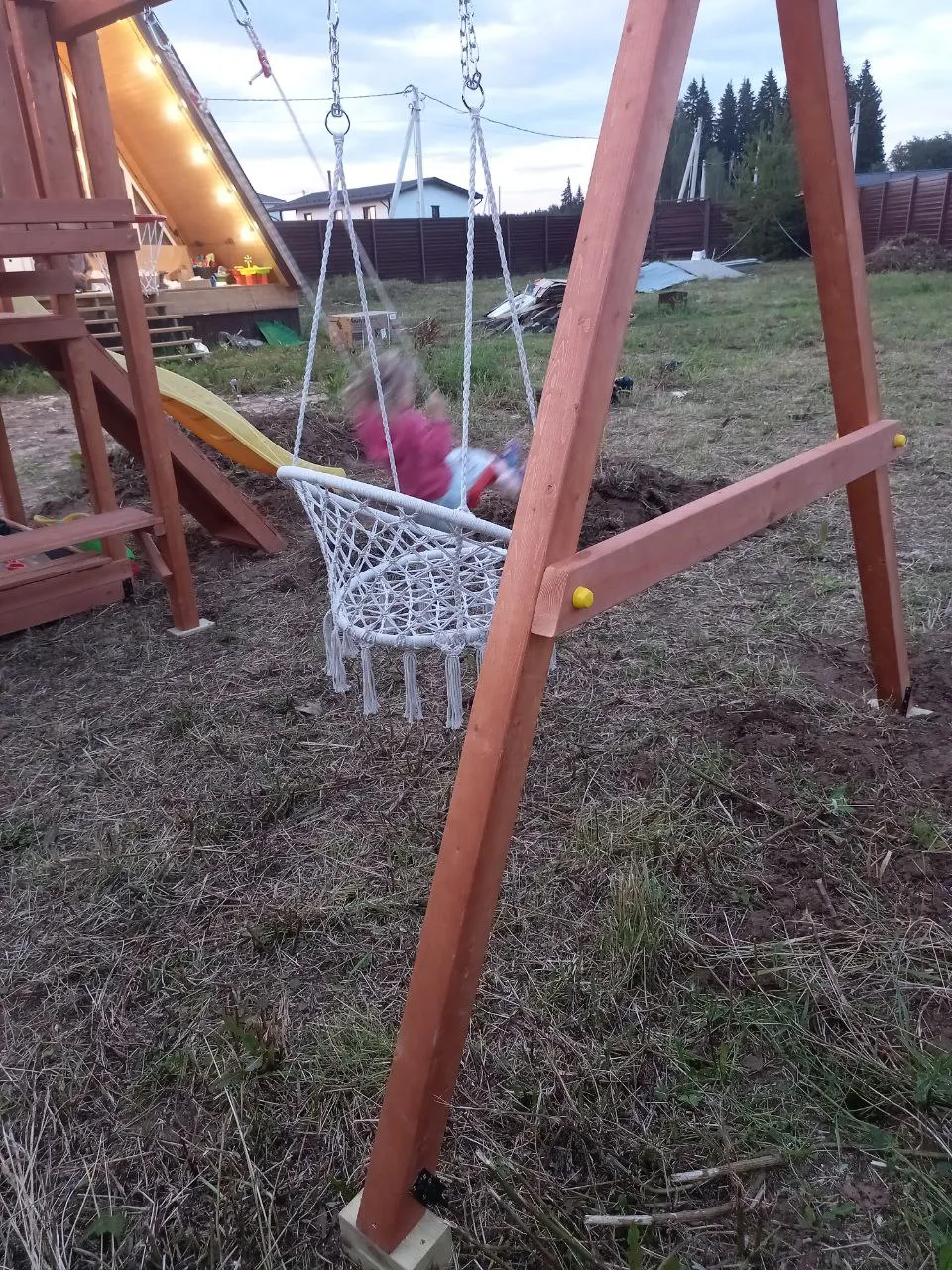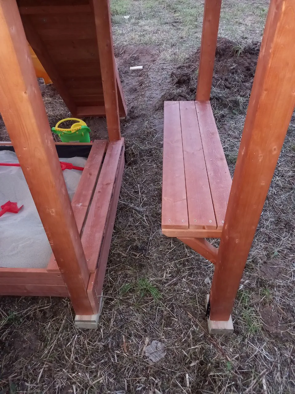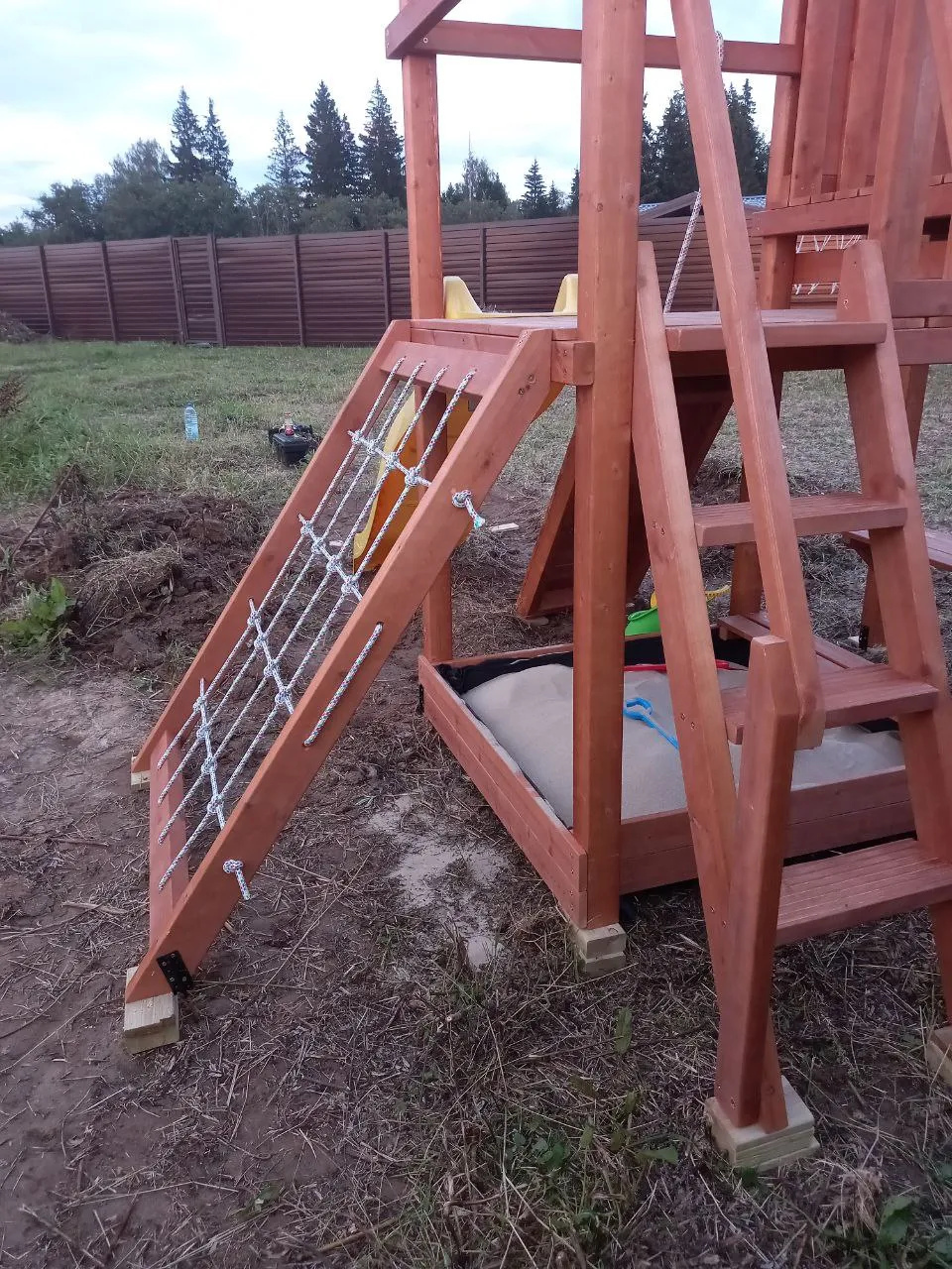 Конструкция из клеёного бруса 75×75 мм и массива сосны соответствует ГОСТ 52169-2012. Поверхности отшлифованы, углы скруглены, все болты защищены несъёмными заглушками. Натуральные материалы, устойчивость к погоде и полная безопасность — стандарт Савушка.