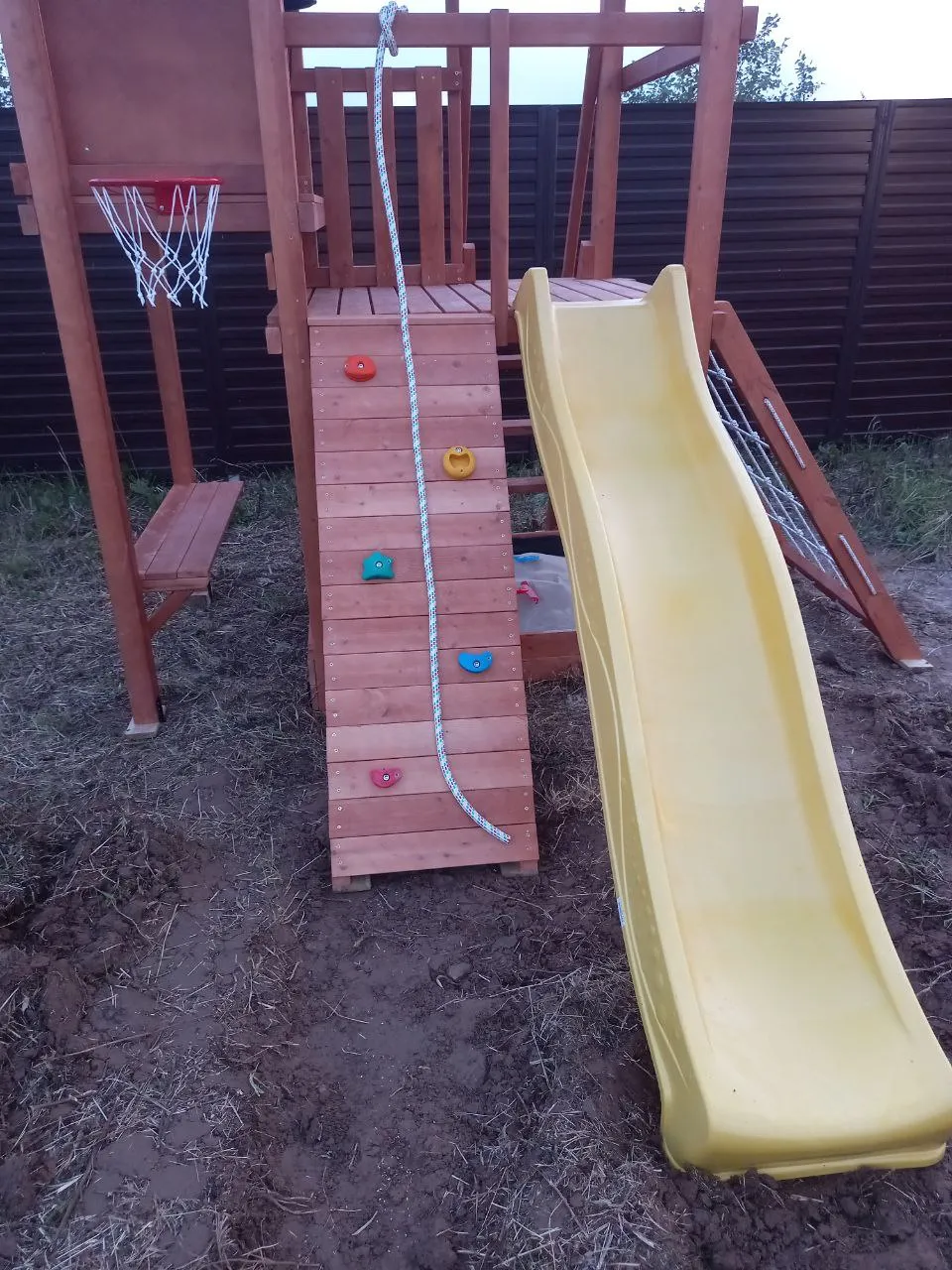 Скалодром, сетка-лазалка и лестница с поручнями — развитие силы и ловкости.