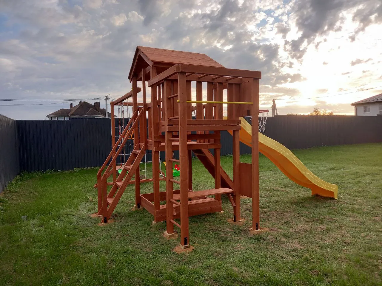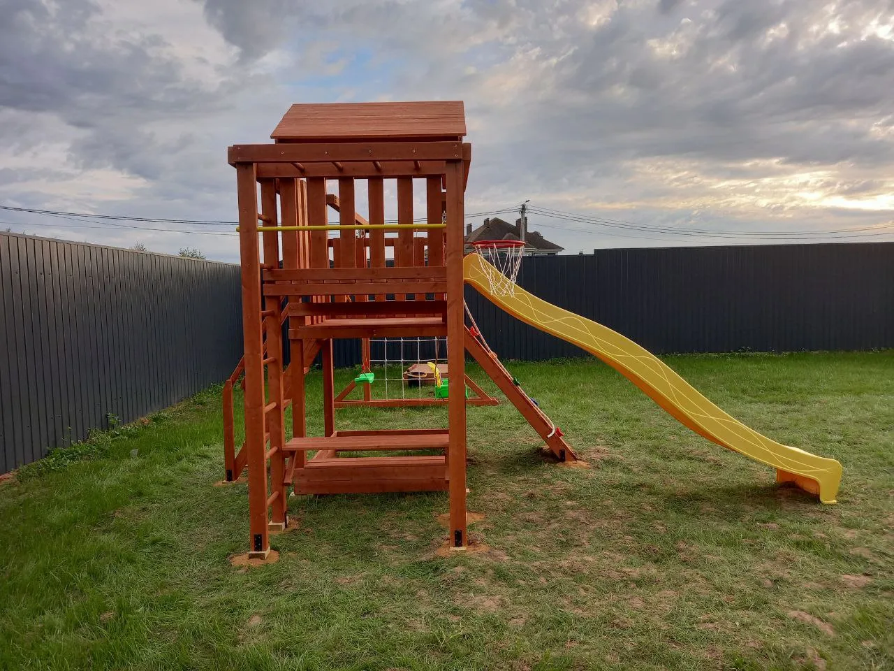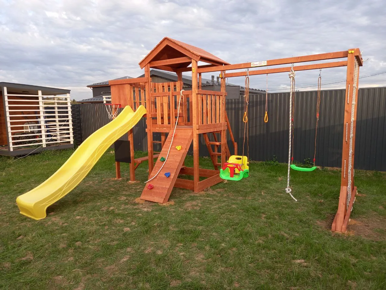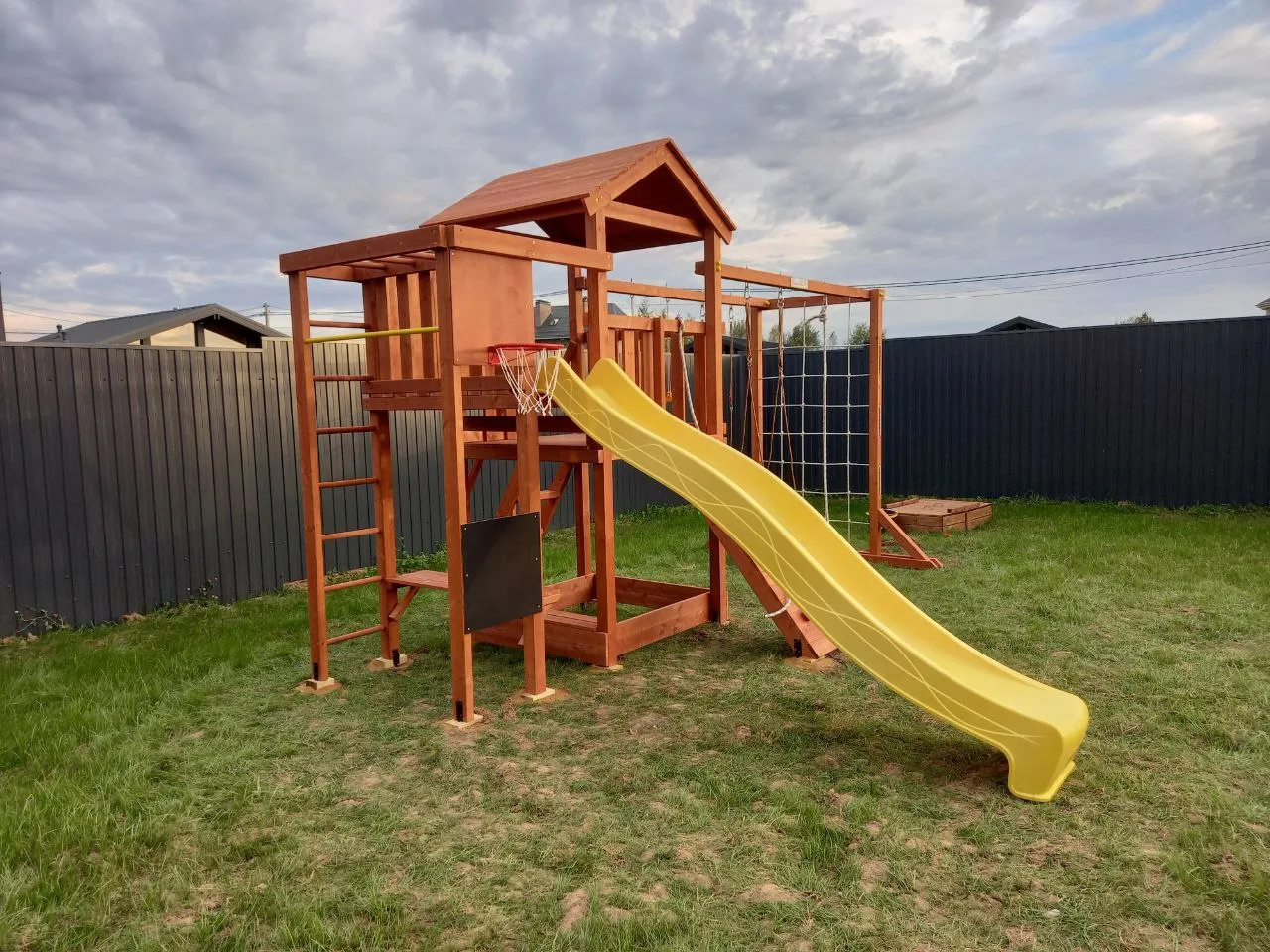 Дополнительно площадка оснащена спортивными элементами: баскетбольным кольцом, турником, гимнастическими кольцами, шведской стенкой, канатом и сеткой-лазалкой.