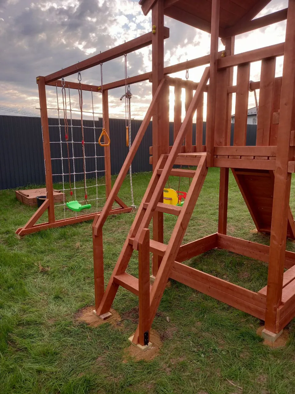 Безопасность – главный приоритет при установке детской игровой конструкции. В производстве используется клееный брус, который обладает высокой прочностью и надежностью. Все материалы сертифицированы и покрыты экологически безопасным лакокрасочным составом Sherwin-Williams. Это покрытие соответствует строгим стандартам безопасности и разрешено для использования на детских площадках.