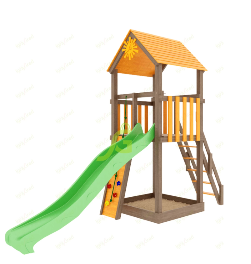 - - песочница - расположенная на первом уровне, она надёжно защищена деревянной крышей, так что играя там, ребёнку будут не страшны солнечные лучи и внезапный дождь;