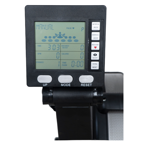 Показания консоли - время / дистанция / количество гребков / количество гребков в мин. / количество калорий / пульс