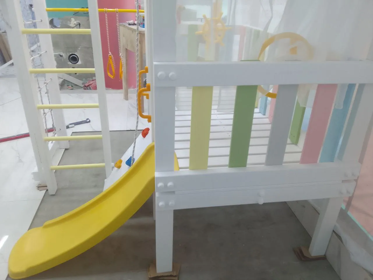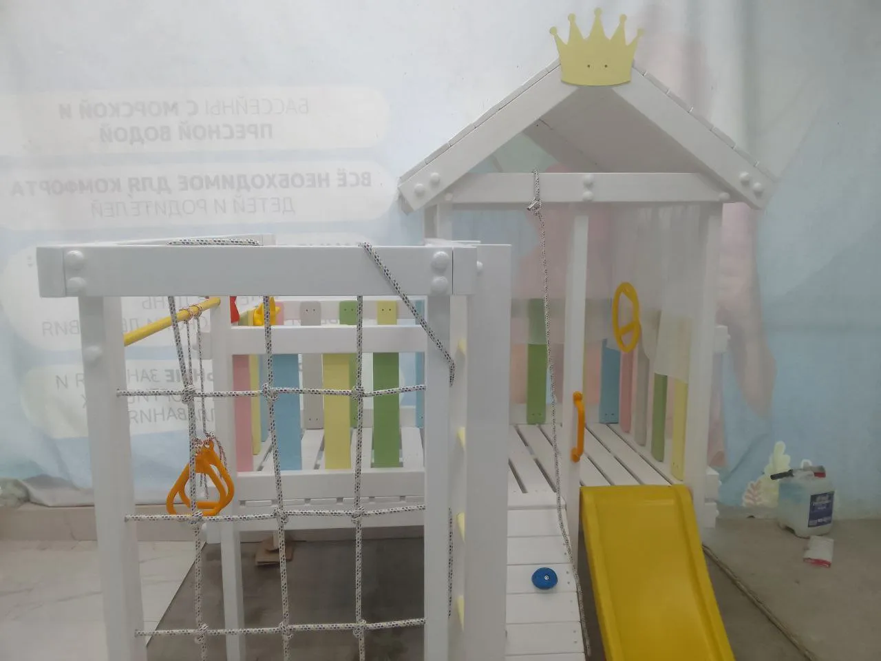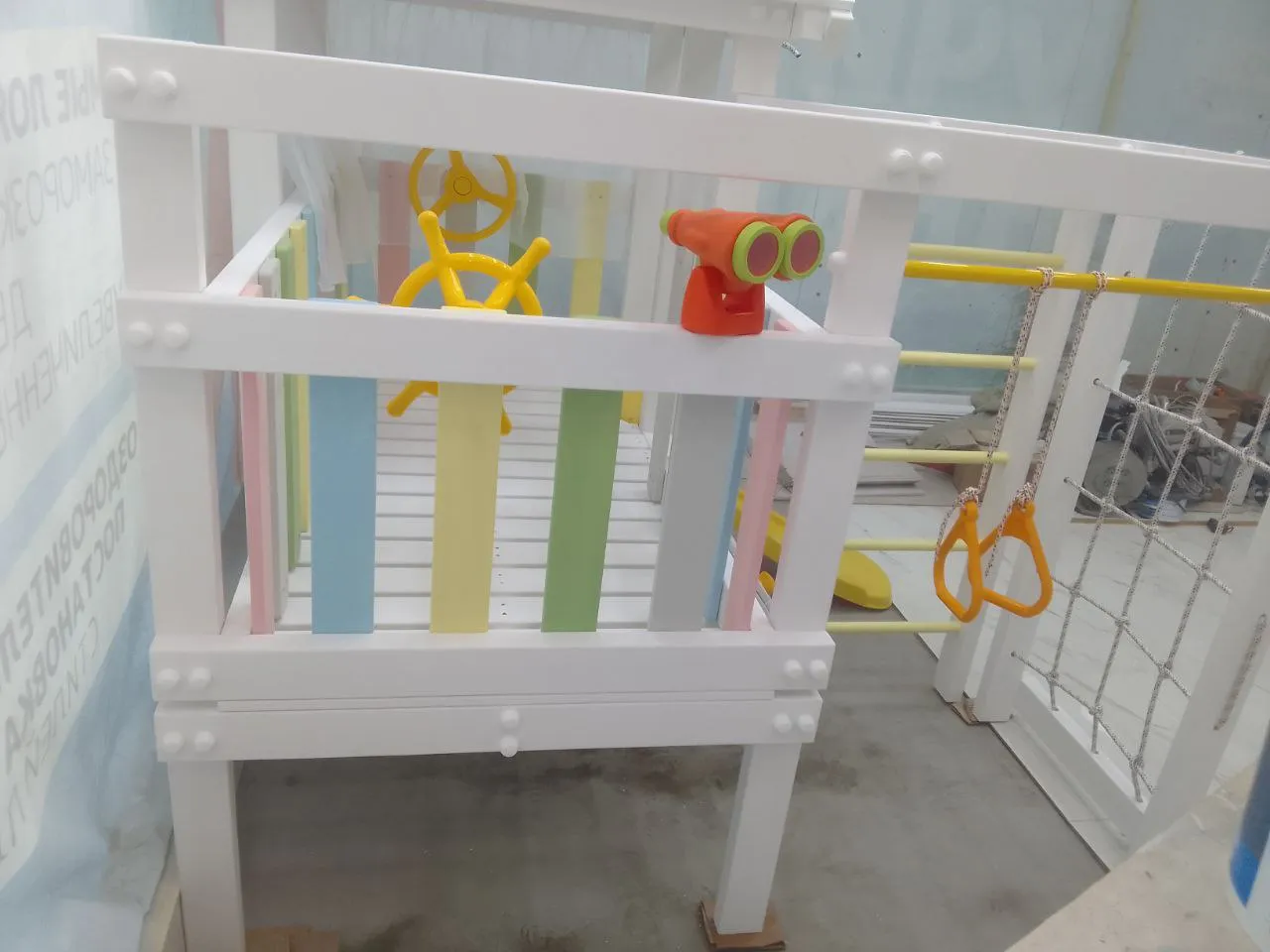 В комплекте площадки есть все, чтобы сделать отдых ребенка интересным, комфортным и разнообразным. Сетка-лазалка и горка для «экстремальных» развлечений. Уютный игровой домик с крышей и балконом для общения и неподвижных игр; бинокль и штурвал для «путешествий» и развития воображения. А чтобы тренировать силу и ловкость малышей, установлены шведская стенка, турник, гимнастические кольца.