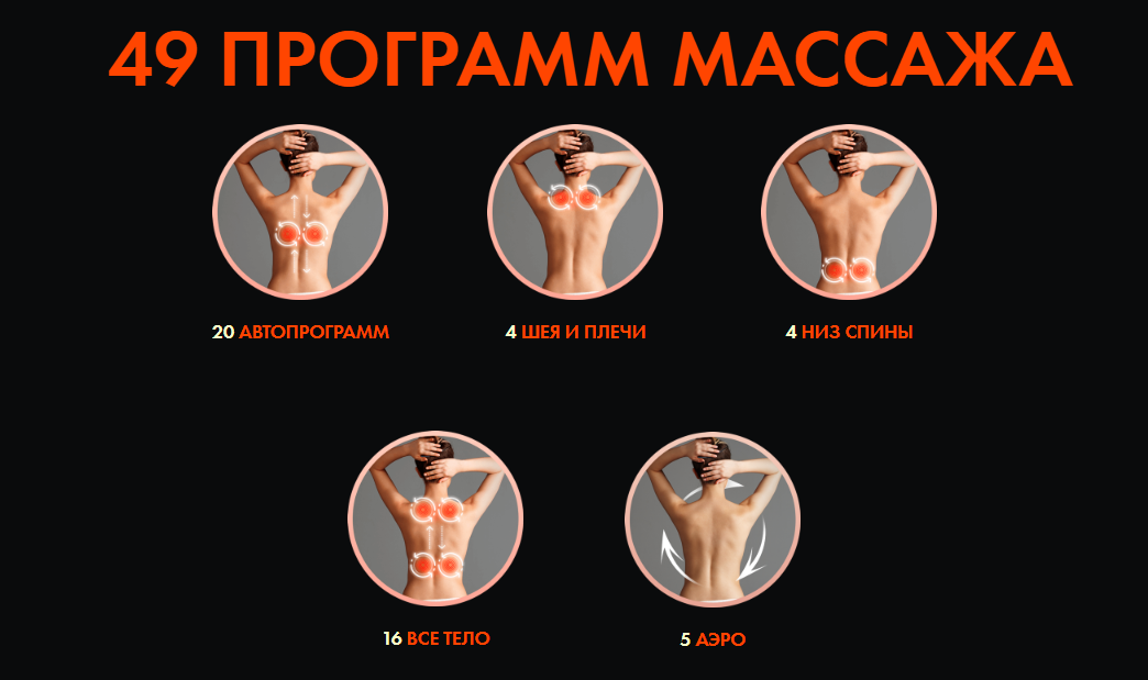 | Зоны массажа | Шея / Спина / Поясница / Плечи / Руки / Бедра / Ягодицы / Икры / Стопы |