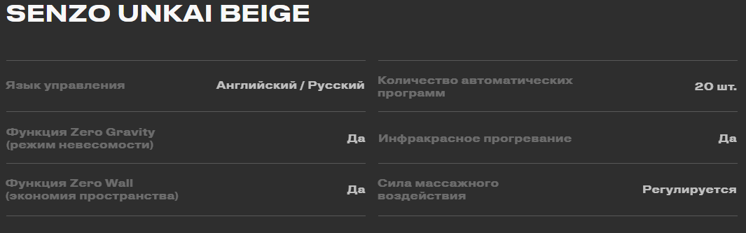 • 2 положения невесомости Zero-G (150° и 176°) для полного восстановления организма, снижения нагрузки на позвоночник и мышцы, эффективного массажа глубоких тканей, улучшения кровообращения и притока кислорода