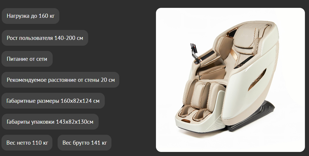 • Улучшенная конструкция кресла создает идеальное положение тела, и в сочетании с передовыми технологиями массажа, каждый сеанс станет незабываемым опытом релаксации и восстановления