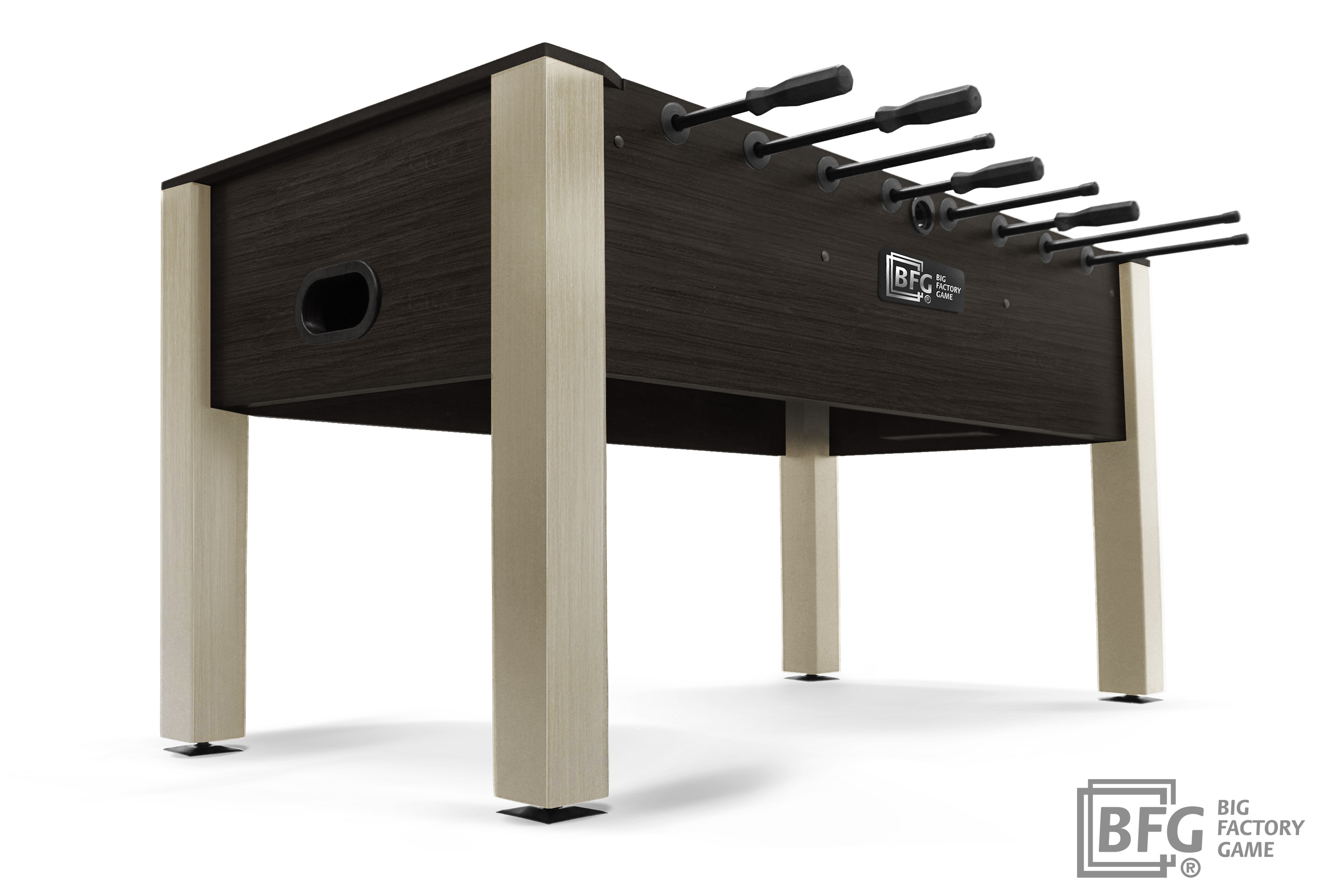Стол оборудован профессиональными штангами и стилизованными фигурками игроков, выполненными из долговечных и прочных материалов. Ключевым преимуществом модели является материал - стол изготовлен из натурального массива древесины с применением шпона ценных пород.