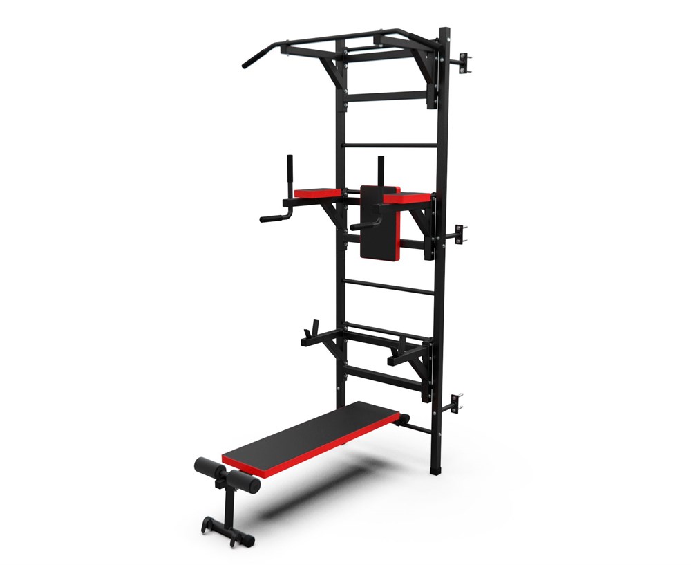 Турник длиной 99 см оснащён мягкими неопреновыми ручками, очень легко перевешивается на перекладины шведской стенки, что позволяет менять его высоту. Расстояние от ручек турника до шведской стенки (вынос турника) - 72 см. Вынос брусьев – 87 см, размер подушки под спину 42 х 25 см, а её толщина 5 см. Подушки подлокотников размерами 25 х 13 х 5 см, а поручни длиной 32 см диаметром 25 мм и толщиной стали 1,5 мм.