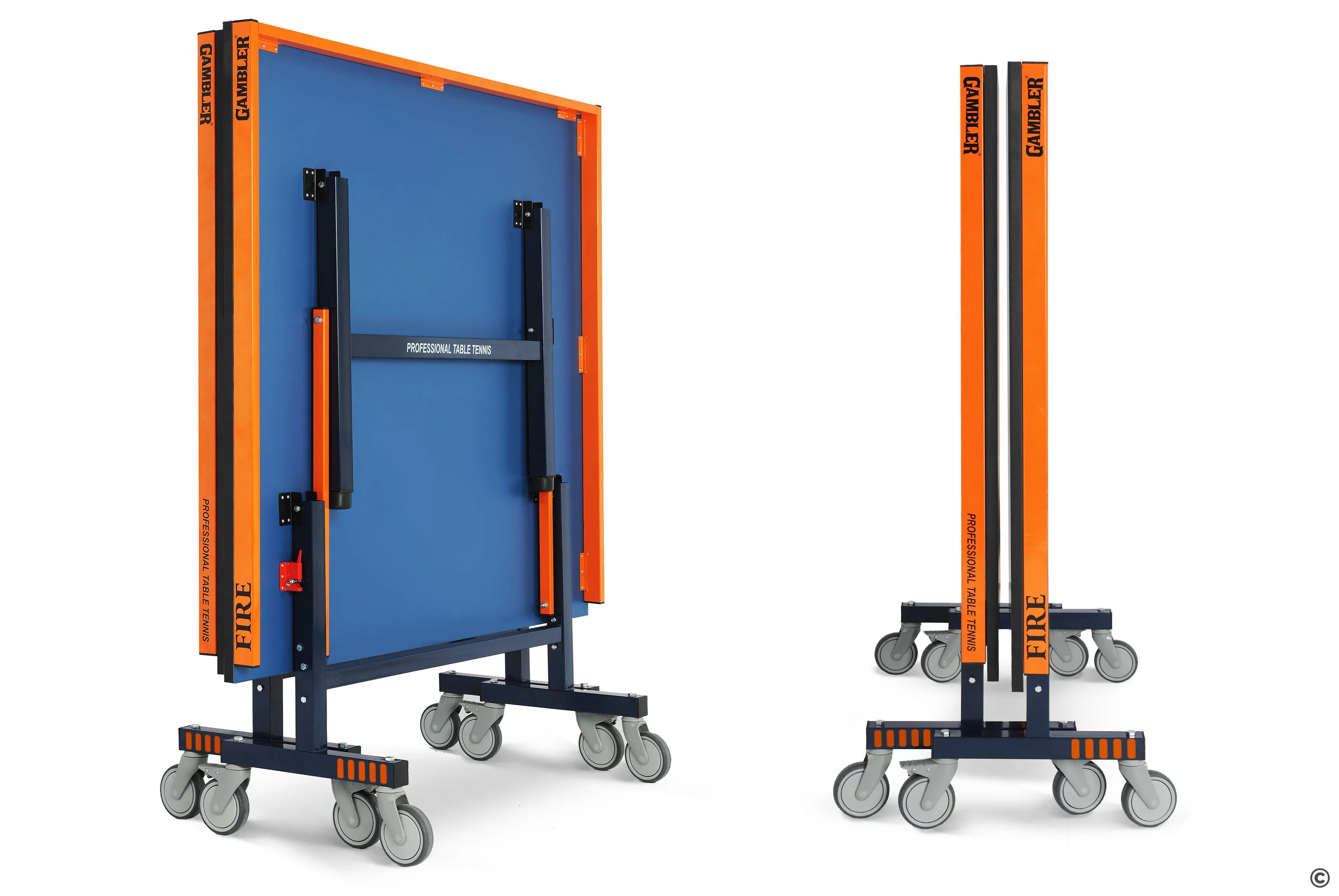 Fire Gambler предназначен для профессиональных игр в закрытых помещениях, идеален для тренировок в спортивных клубах и для проведения турниров. Имеет массивную столешницу толщиной 25 мм и базируется на металлической тележке с 8 транспортировочными обрезиненными роликами.