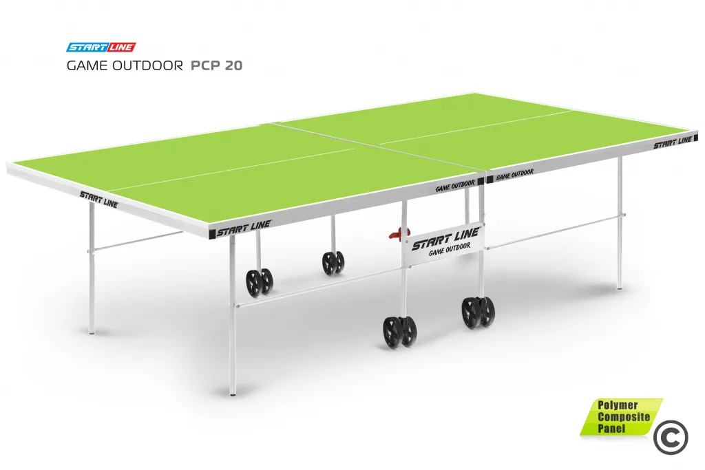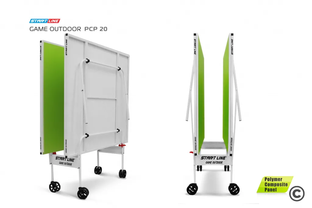 Новой моделью с новой столешницей PCP 20 мм стал теннисный стол Game Outdoor PCP 20. Это универсальный вариант всепогодного стола. Маневренность достигается за счет двойных обрезиненных роликов, модель легко перемещать. Конструкция предусматривает компактную систему трансформации и продумана таким образом, чтобы использовать его мог даже один человек.