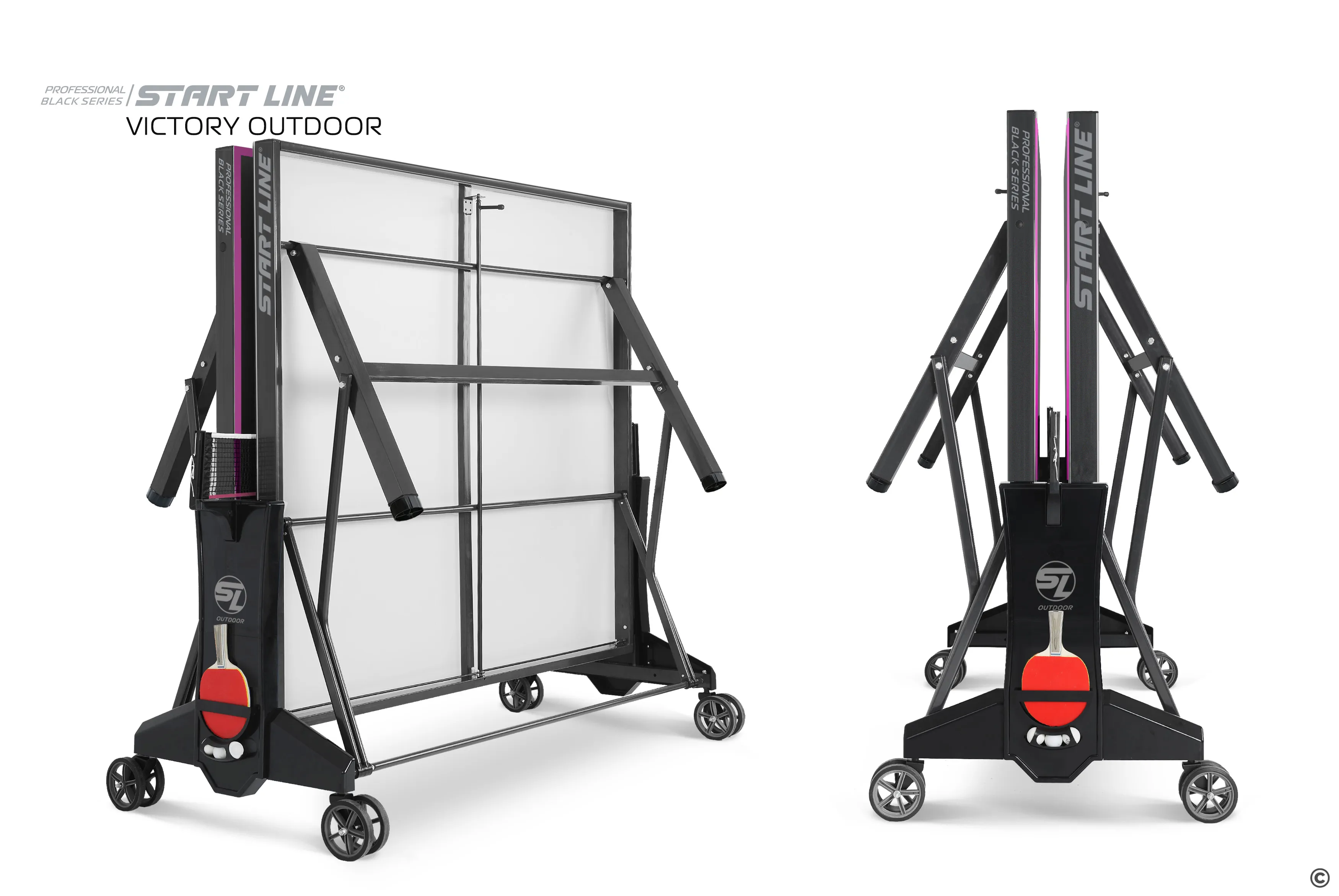 Комфортная система складывания стола является собственной авторской разработкой Start Line. Она предусматривает усовершенствованный механизм, позволяющий быстро и надежно закрепить положение стола как в разложенном, так и в сложенном виде. Все манипуляции производятся с рабочего места игрока для каждой из столешниц. С такой системой складывания легко справляется один человек, а стол при хранении занимает минимум пространства. Дополнительная фиксация стола в сложенном виде позволяет просто и безопасно транспортировать стол. Конструкцией предусмотрен режим одиночной игры PLAYBACK для самостоятельной проработки точности ударов.